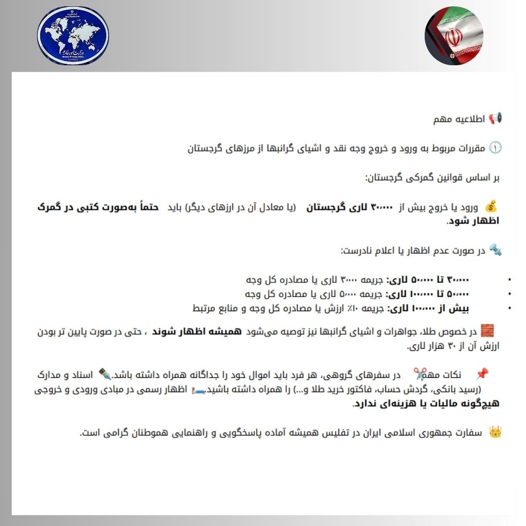 بر اساس قوانین و مقررات گمرکی کشور گرجستان، ورود یا خروج هرگونه وجه نقد یا اوراق بهادار به ارزش بیش از ۳۰٬۰۰۰ لاری گرجستان (یا معادل آن در سایر ارزها)، صرفاً از طریق اظهار کتبی در گمرک مجاز بوده و در صورت عدم اظهار یا اعلام نادرست، مطابق با مقررات گمرکی گرجستان، انواع مجازات زیر اعمال خواهد شد: