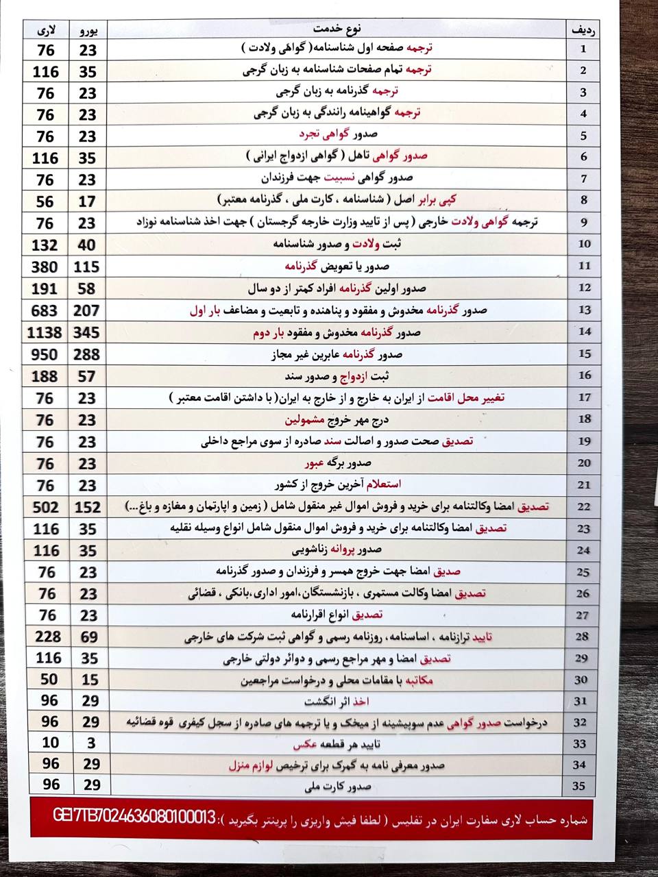 به اطلاع هموطنان گرامی می رساند: طبق جدول فوق الذکروبراساس تصویب نامه هیات محترم وزیران به شماره ۱۲۰۲۸۰ مورخ ۱۴۰۴/۰۷/۲۶،  تعرفه خدمات کنسولی تغییر یافته است و خدمات کنسولی من بعد با نرخ جدید محاسبه و اعمال می‌گردد. لذا در مراجعه به بخش کنسولی و قبل از واریز هر وجهی از تعرفه جدید اطمینان حاصل نموده، سپس برابر نرخ های مصوب جدید اقدام به واریز وجه نمایید .