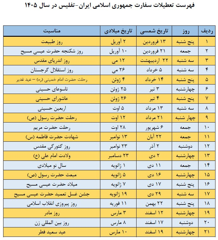 فهرست تعطیلات سفارت جمهوری اسلامی ایران - تفلیس در سال 1405